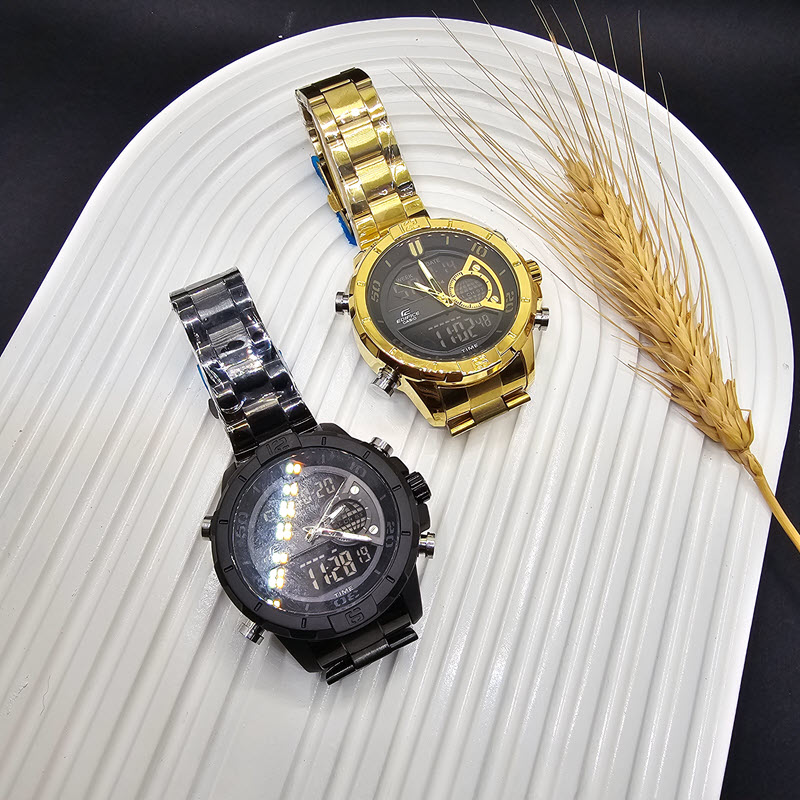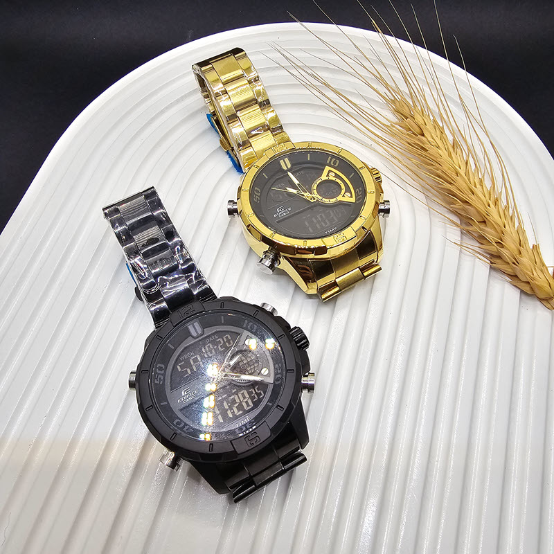 طراحی قاب گرد و بزرگ با نمایشگر دیجیتال و عقربهای همزمان، جلوهای مدرن و اسپرت به ساعت میدهد و آن را برای استایل روزمره و مجلسی مناسب میسازد. بند استیل ضدزنگ، هم جلوهای لوکس به ساعت میبخشد و هم دوام بالایی دارد. دو رنگ مشکی و طلایی این مدل، امکان انتخاب مطابق با سلیقه شخصی را برای خریداران فراهم میکند.