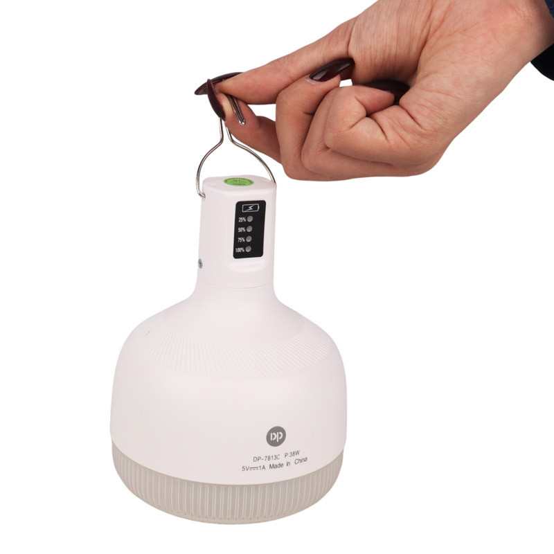 لامپ شارژی DP-7813C با بدنهای از پلاستیک فشرده و مقاوم عرضه شده که وزن کم آن حمل و نصب را آسان میکند. حلقه فلزی در بالای لامپ هم برای آویزان کردن داخل چادر یا محیط کار تعبیه شده که به کاربردپذیری میافزاید. ابعاد جمع و جور و طراحی ارگونومیک، DP-7813C را به گزینهای عالی برای کمپینگ، مسافرت و حتی کارهای فنی تبدیل میکند. ظاهر مدرن و نمایشگر دیجیتال سطح باتری، حس استفاده از یک محصول هوشمند را به کاربر منتقل میکند.
